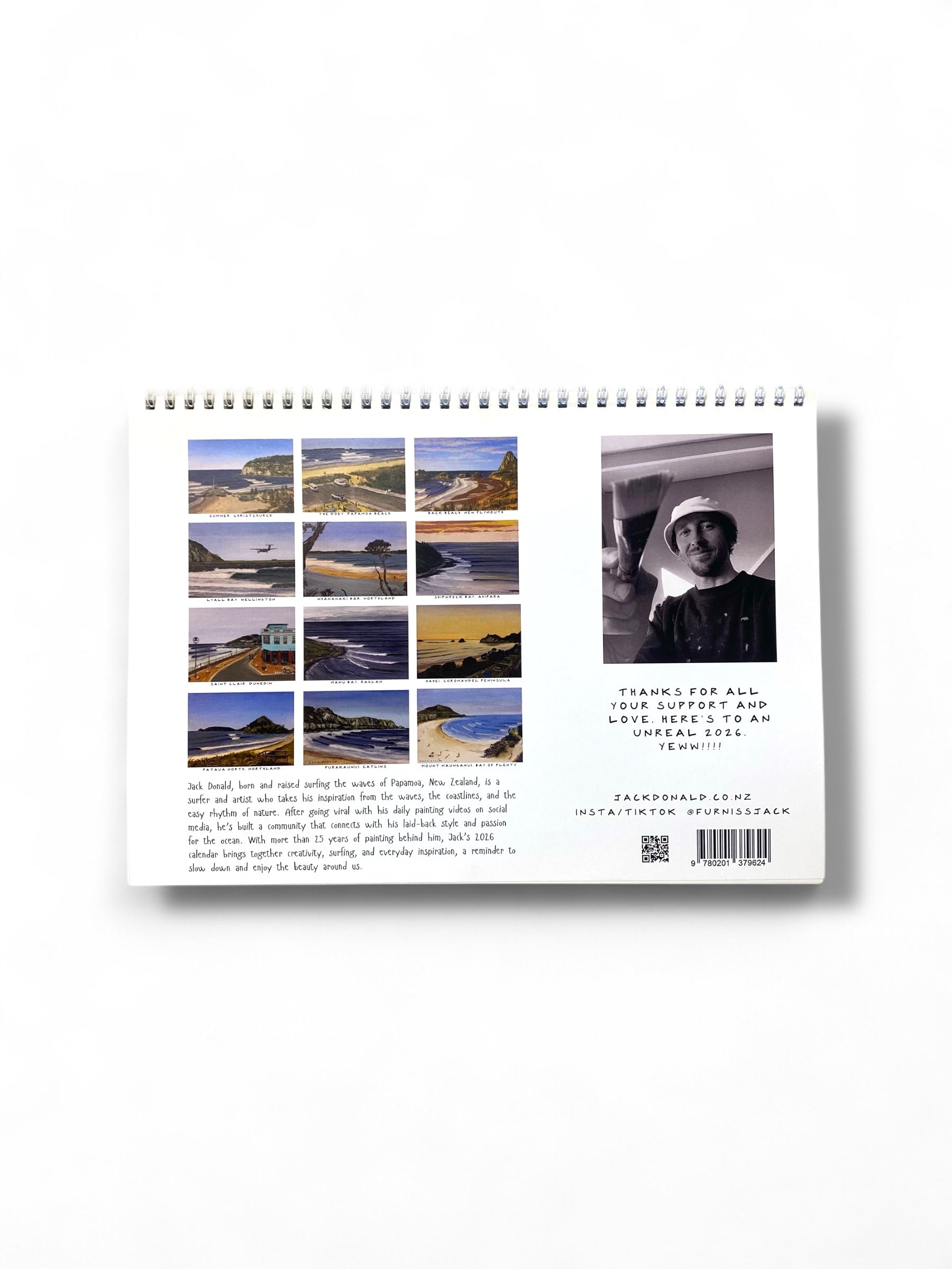 This A4 calendar features twelve hand-painted scenes from around Aotearoa, celebrating some of our most iconic beaches and hidden surf breaks. Each artwork is paired with a spacious monthly date page including New Zealand public holidays.