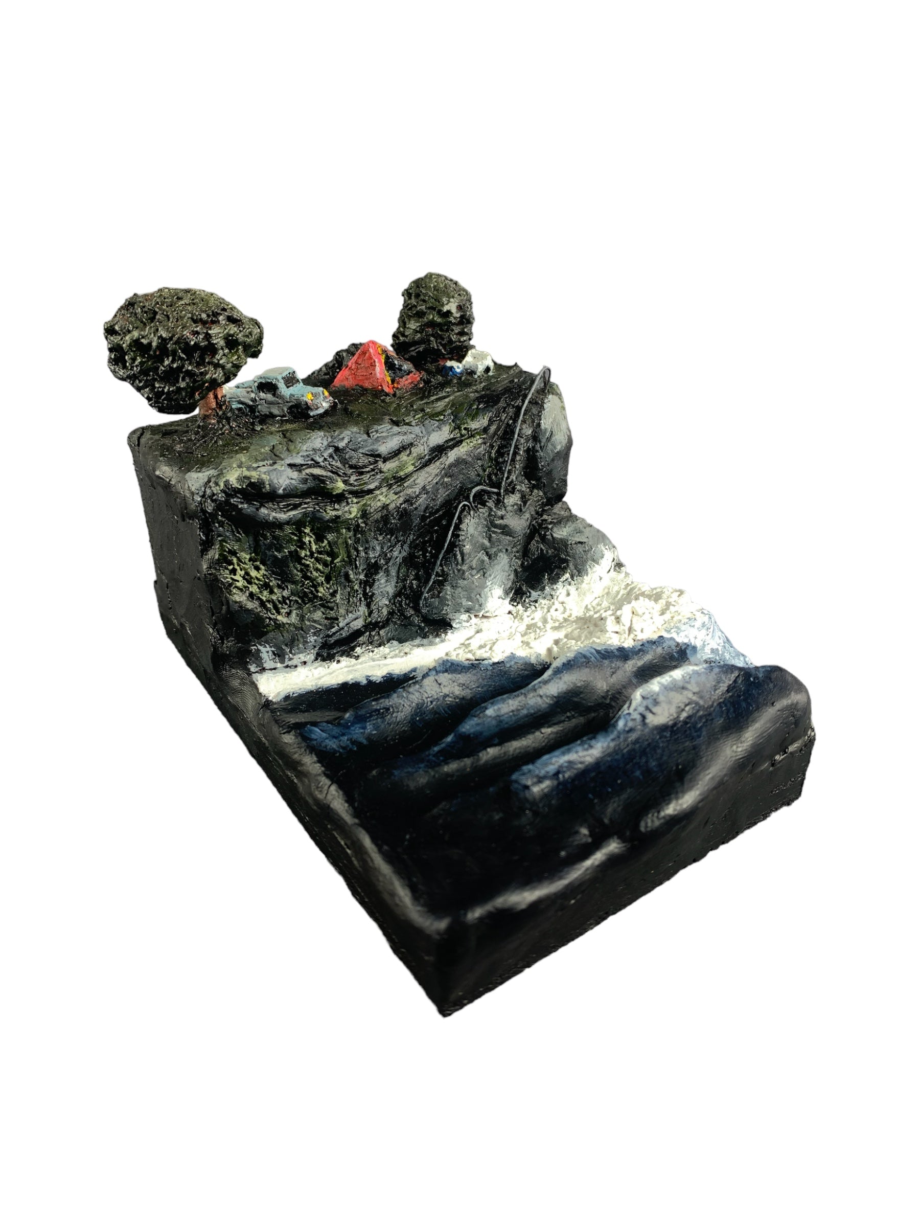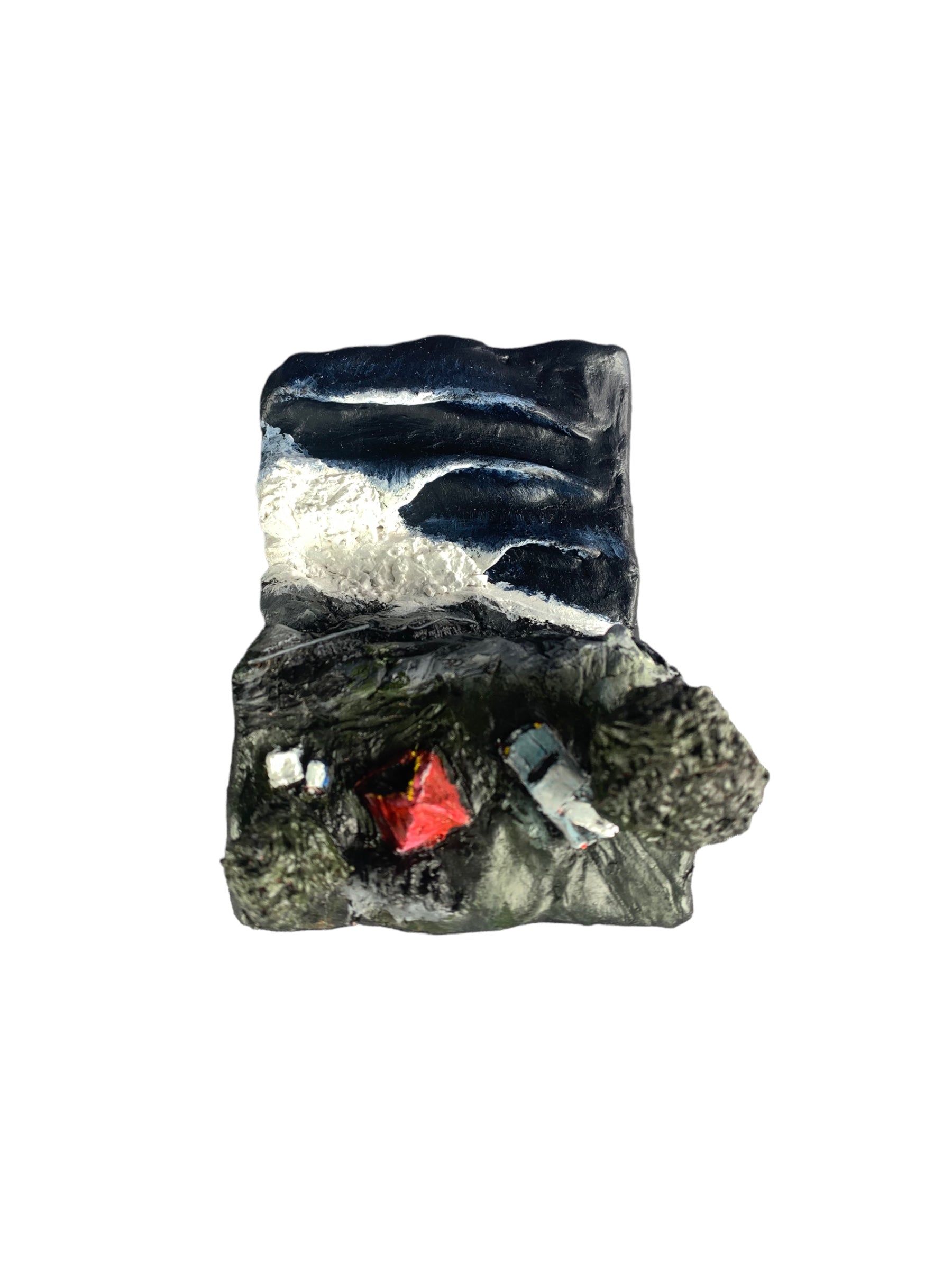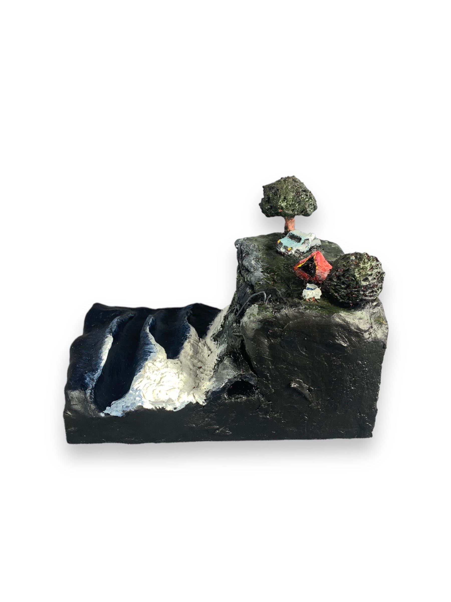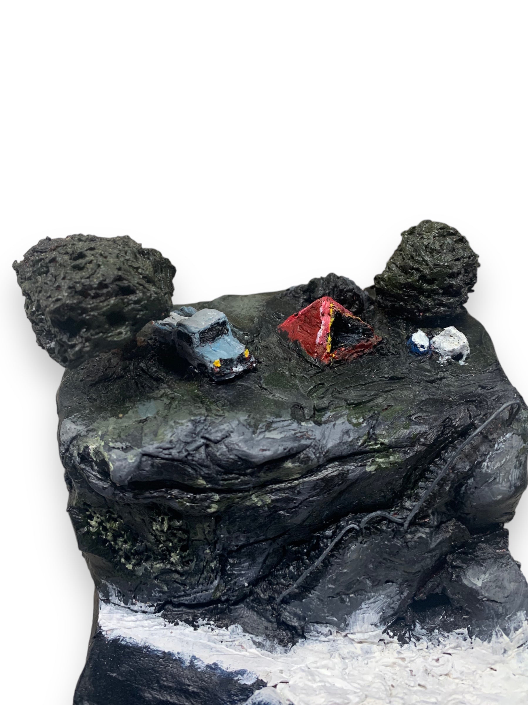 Clay sculpture painted with acrylic on a marine ply base.